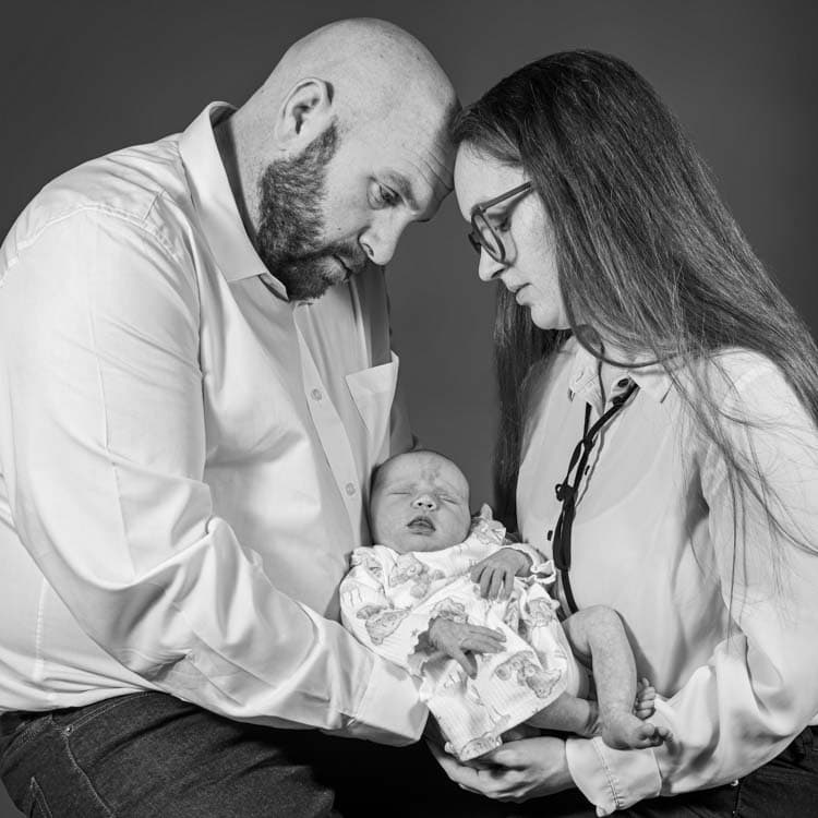 Newborn sessions in my Emsworth studio are designed to be peaceful, warm, and baby‑led. This little one settled beautifully — from resting in a knitted hammock to snuggling into Mum and Dad’s arms. The images from this shoot capture everything I love about newborn photography: connection, tenderness, and those fleeting early expressions that disappear far too quickly.